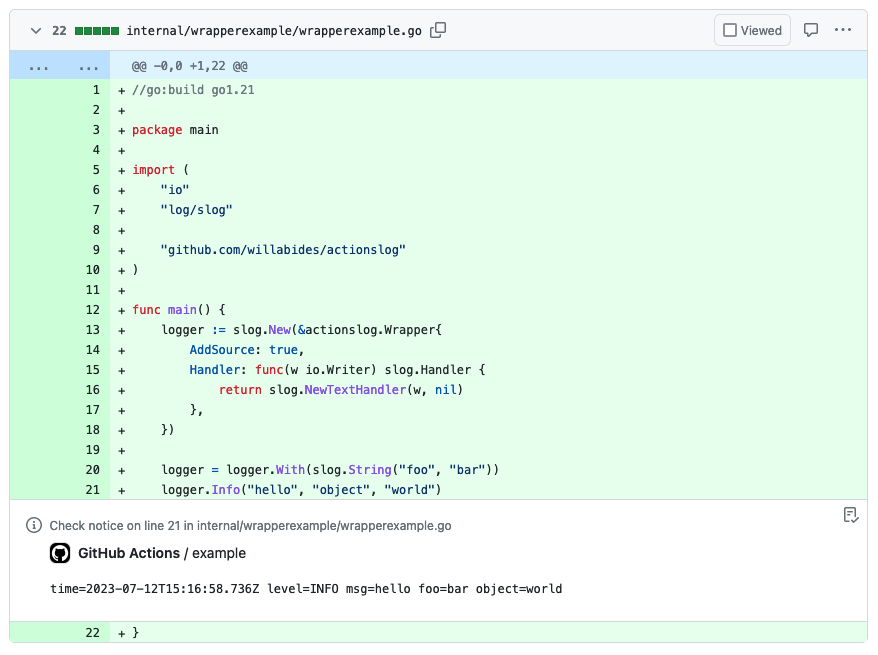 I happened to be working on a GitHub action when the go1.21rc2 announcement prompted me to explore slog. I wanted to make it output logs formatted for GitHub Actions. Specifically, This meant emitting workflow commands for each log level, so that log.Info() appears as a notice, log.Warn() as a warning, and so on. It should also link logs to the line that produced them.